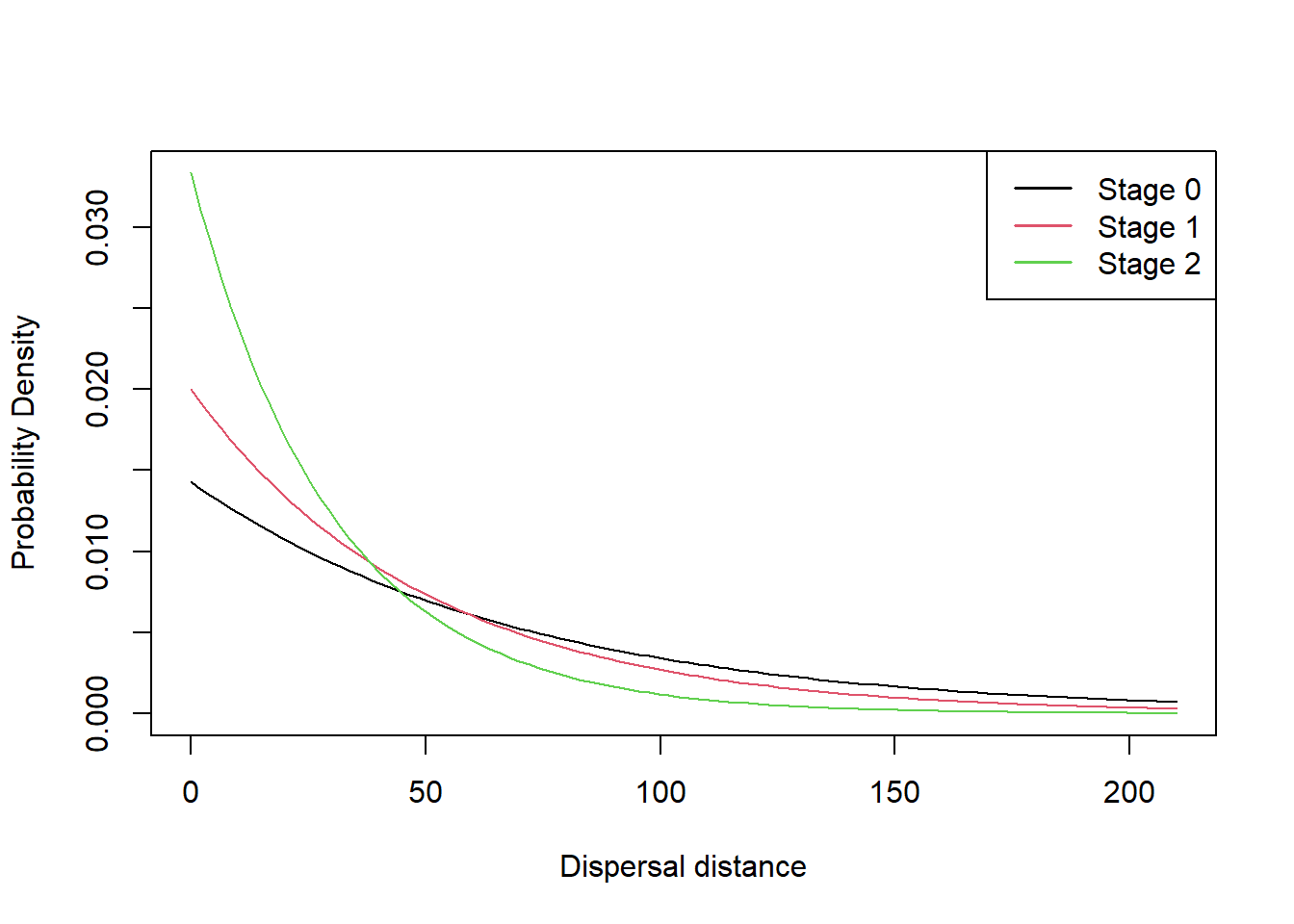 plotProbs(DispersalKernel(Distances = matrix(c(0,1,2,70,50,30),nrow = 3), StageDep = T))