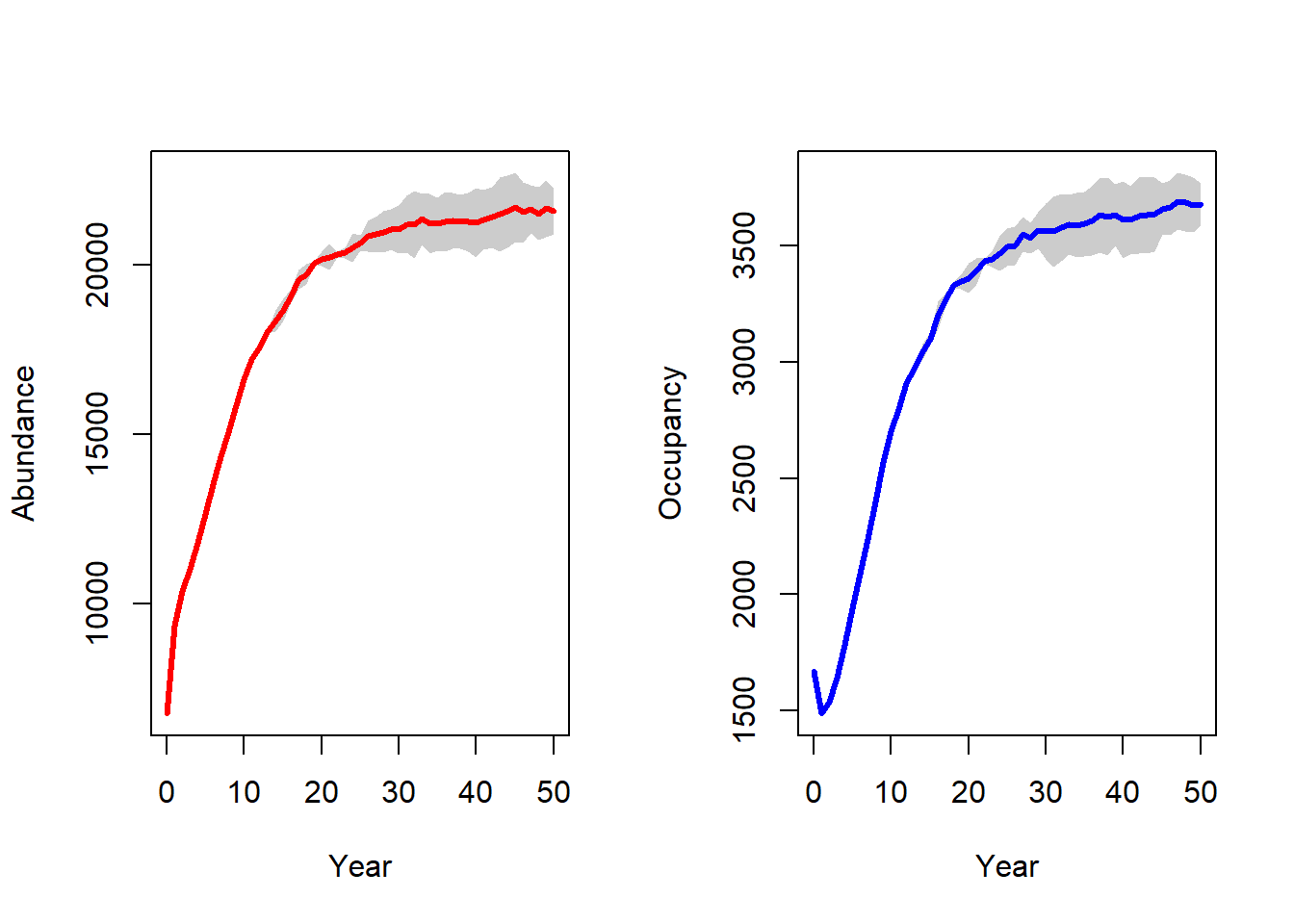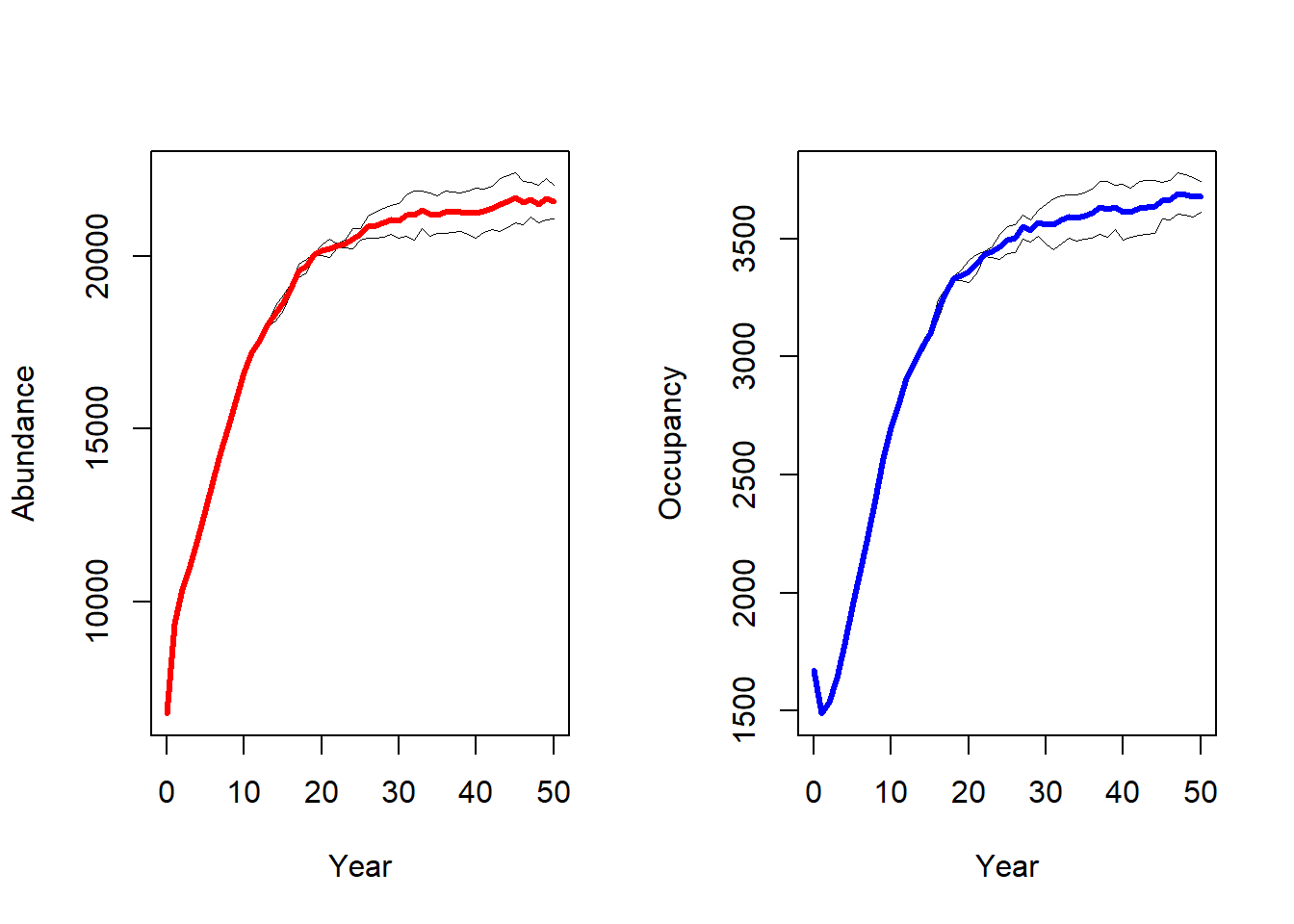 All results are stored in the Outputs folder. RangeShiftR provides some in-built functions to access and plot these results. Here, we plot the abundance and occupancy time series:
