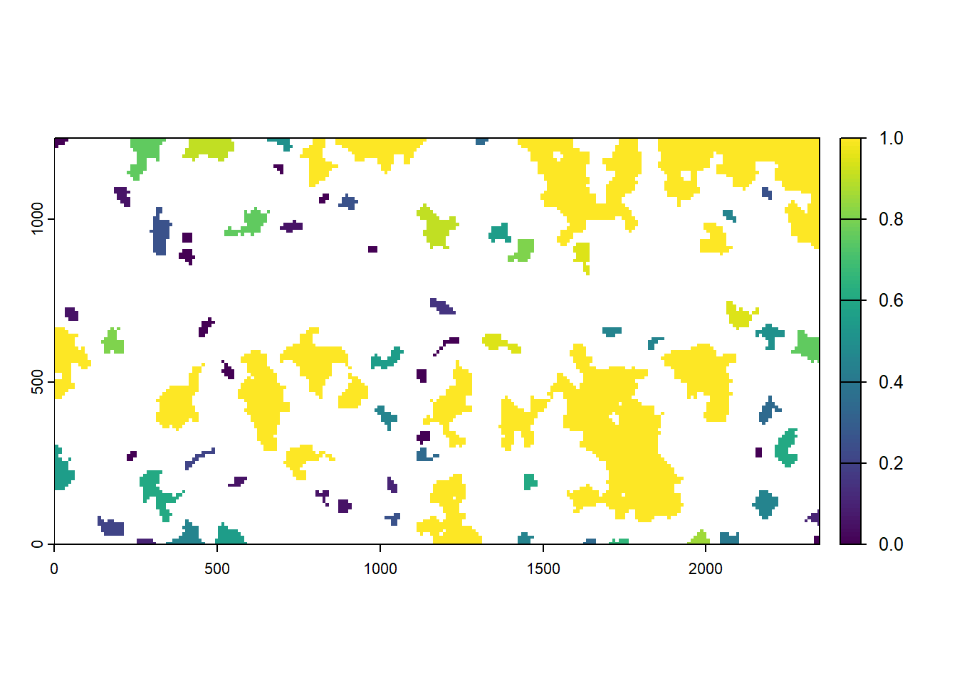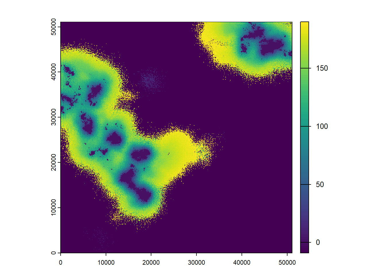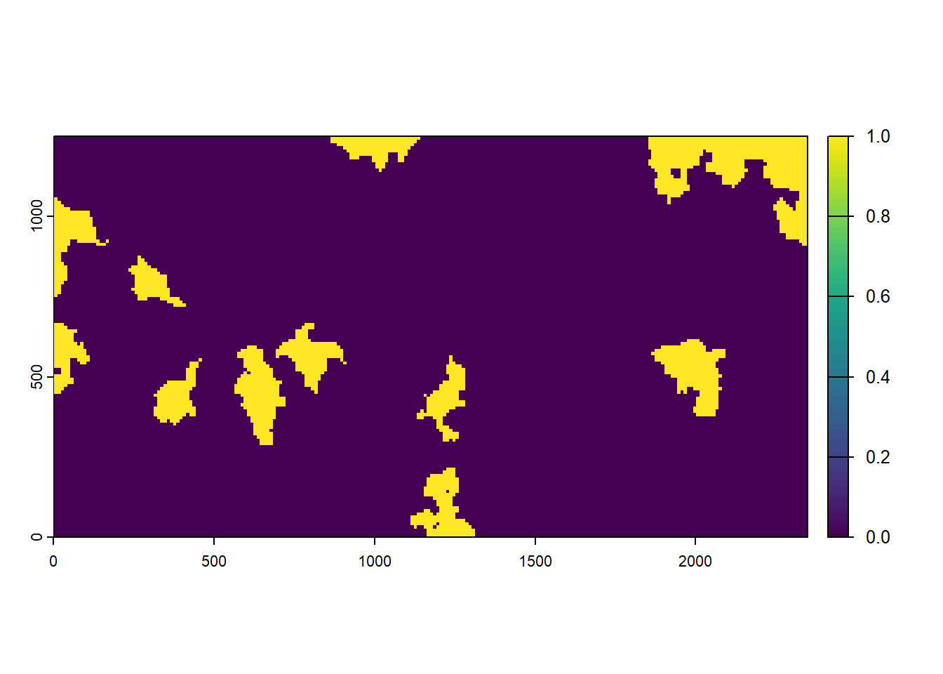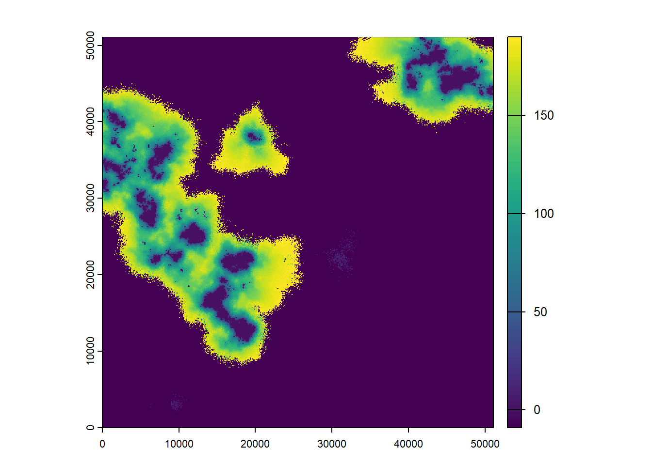 As the last input map, we look at the initial distribution of our model species. According to this map, a few large patches will be initialised at the beginning of the simulation time: