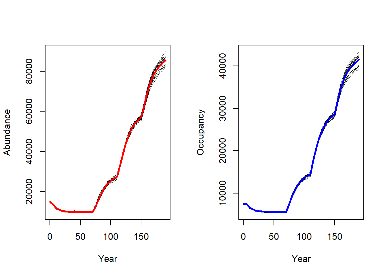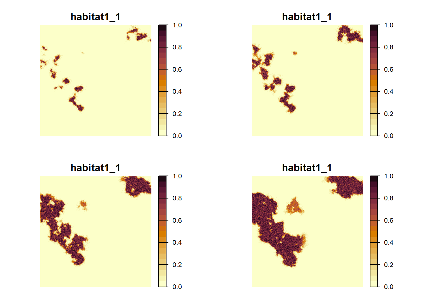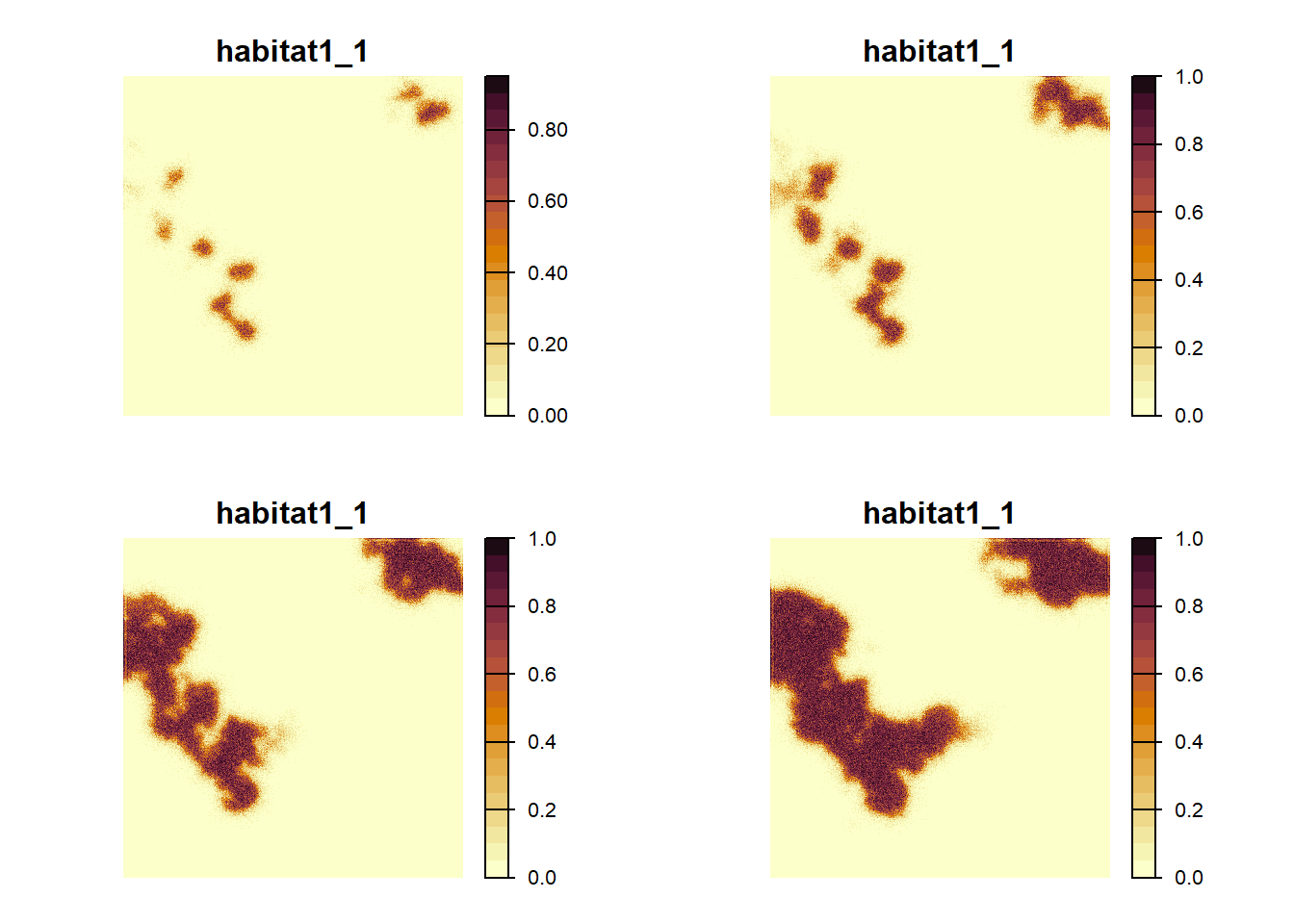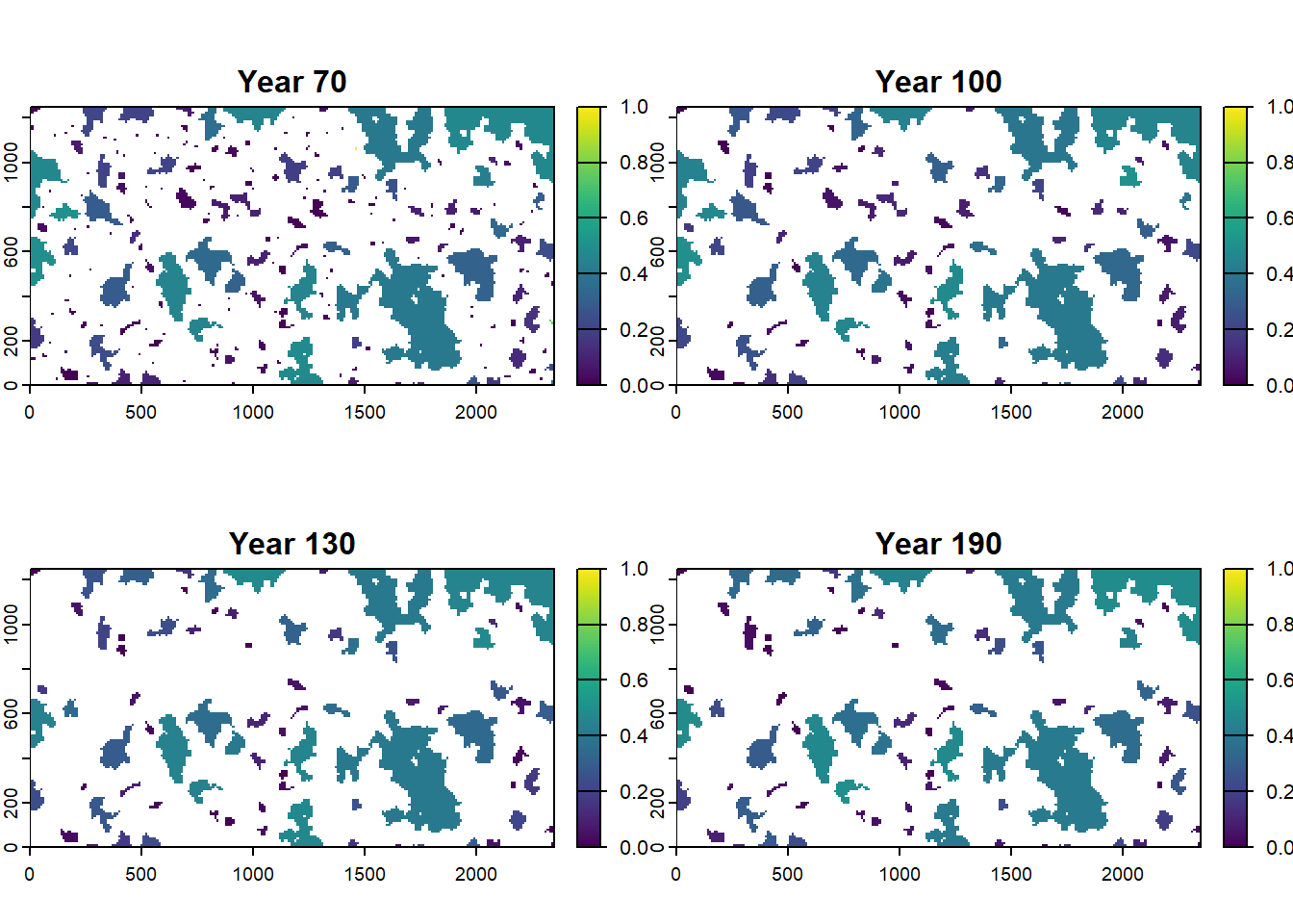 As we can see from these plots, the landscape gets increasingly colonised over the years, as the habitat in the landscape improves for our modelled species.