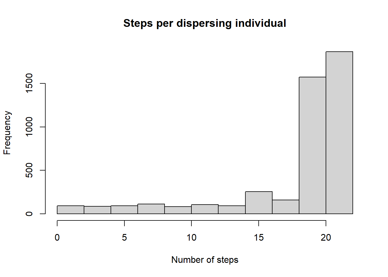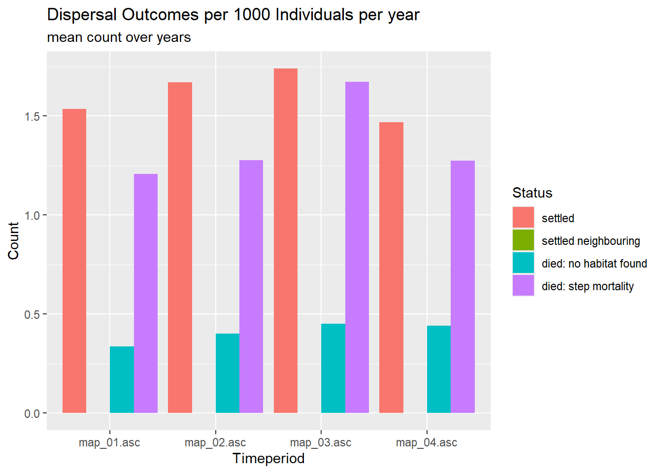 In this plot, the difference doesn’t appear as clearly, but we can still see a faster colonisaton in scenario 1 than in 2.