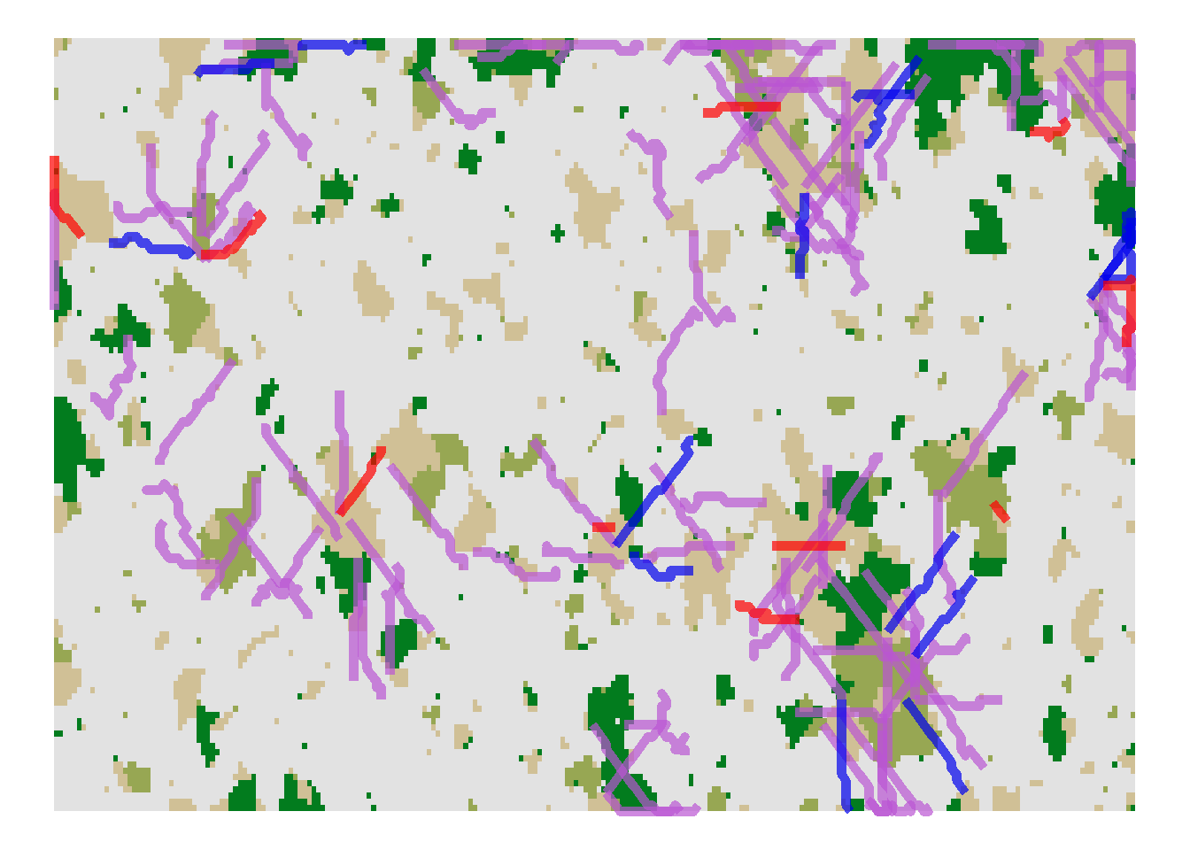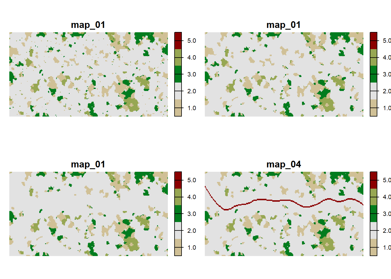 We created a series of four maps (map_01.asc to map_04.asc) that represent different time steps in which a landscape mosaic of woodland and grassland patches in an agricultural matrix gets increasingly disturbed by woodland clearing and the construction of a road.