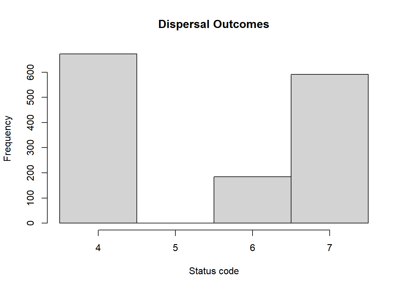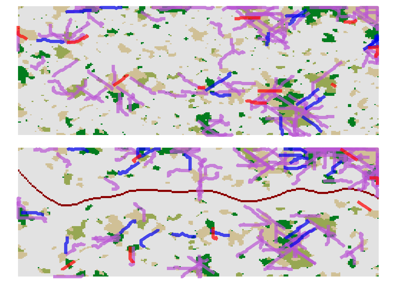 In this scenario, we simulate a patch-matrix landscape that is getting fragmented by the construction of a road. With this example we show some possible ways to analyse the optional SMS paths output.