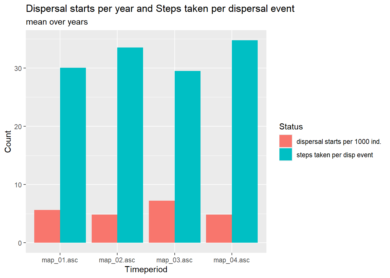 We find that the modelled species manages to colonise newly gained high-quality habitat more quickly in the first scenario using the directed movements and the population is slightly more spread out.