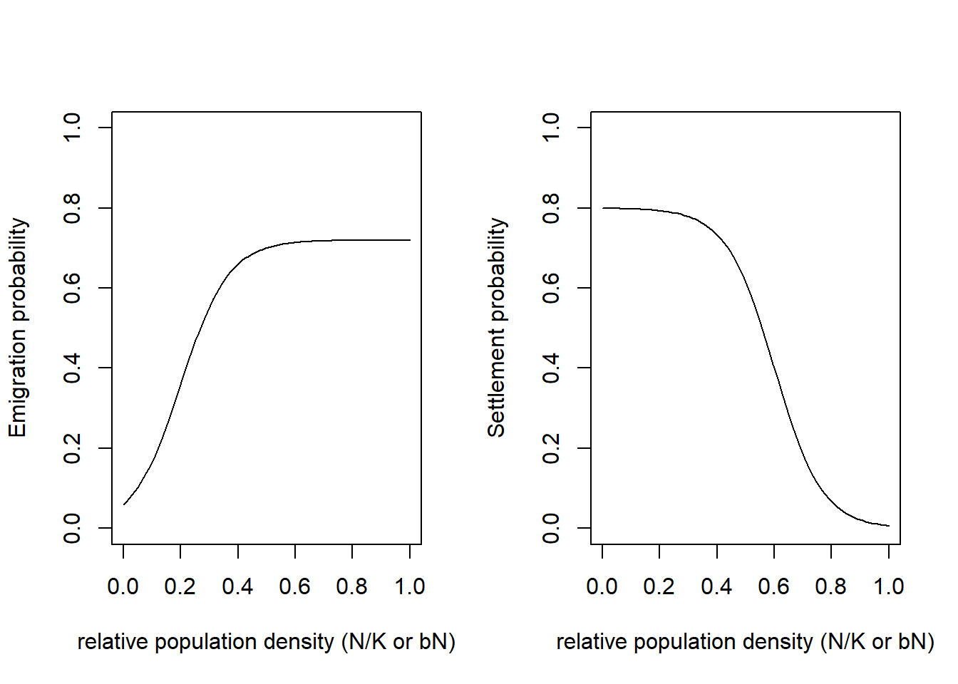 We can inspect the different model settings visually, for example the density dependence in emigration and settlement probability: